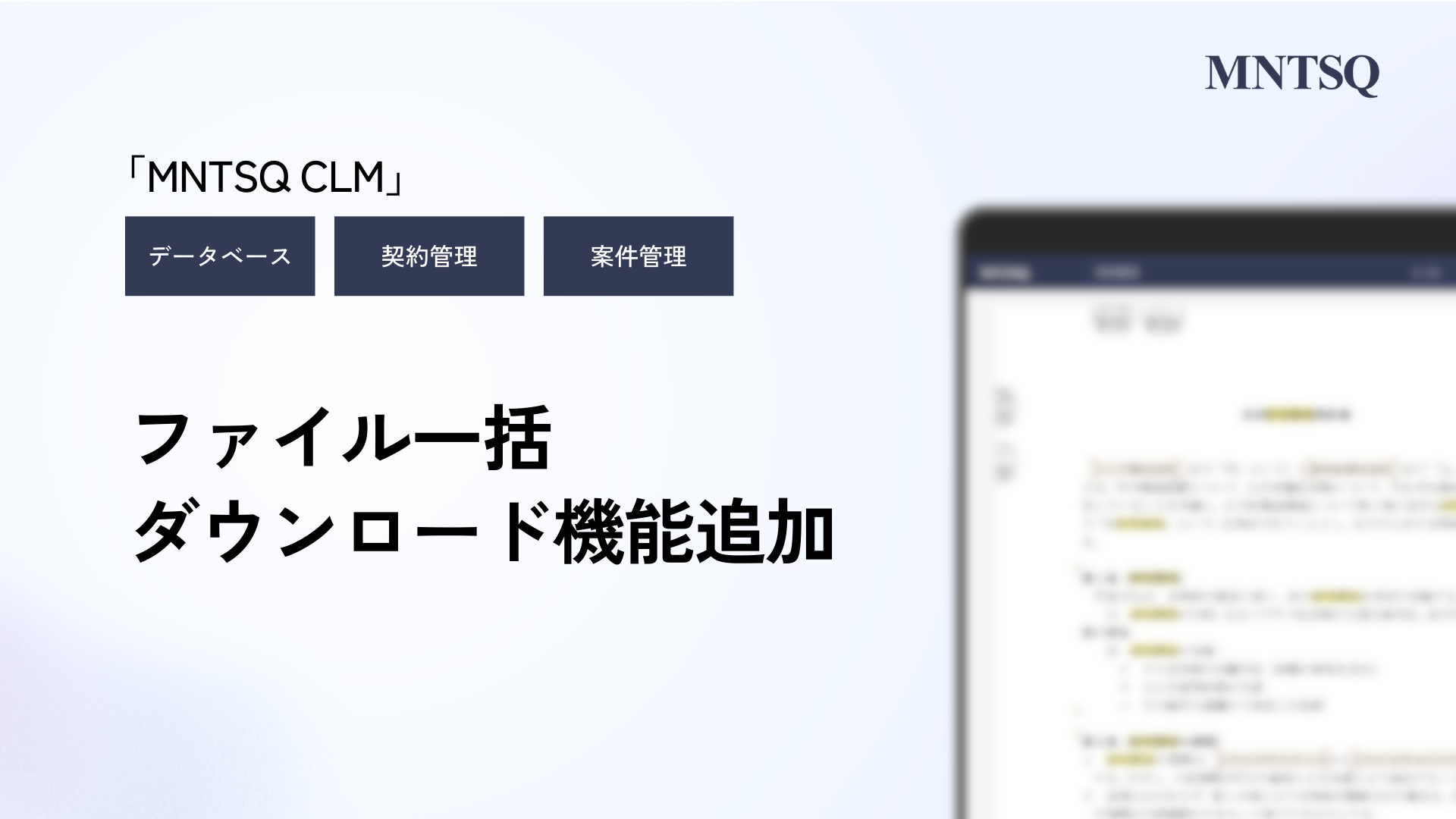「すべての合意をフェアにする」をビジョンに掲げるMNTSQ(モンテスキュー)株式会社(本社:東京都中央区、代表取締役:板谷 隆平、以下「MNTSQ」)は、「MNTSQ CLM」内で提供している全プロダクト(データベース・契約管理・案件管理)に、添付ファイルや関連ファイルなどを、一括でダウンロードできる機能を追加したことをお知らせいたします。