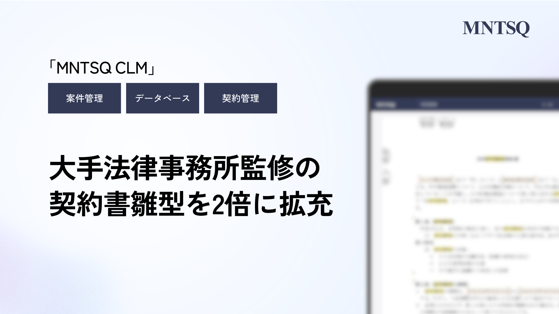 「すべての合意をフェアにする」をビジョンに掲げるMNTSQ株式会社(本社:東京都中央区、代表取締役:板谷 隆平、以下「当社」)は、「MNTSQ CLM」内で提供するMNTSQ雛型のラインナップを、これまでの約2倍に拡充したことをお知らせいたします。
