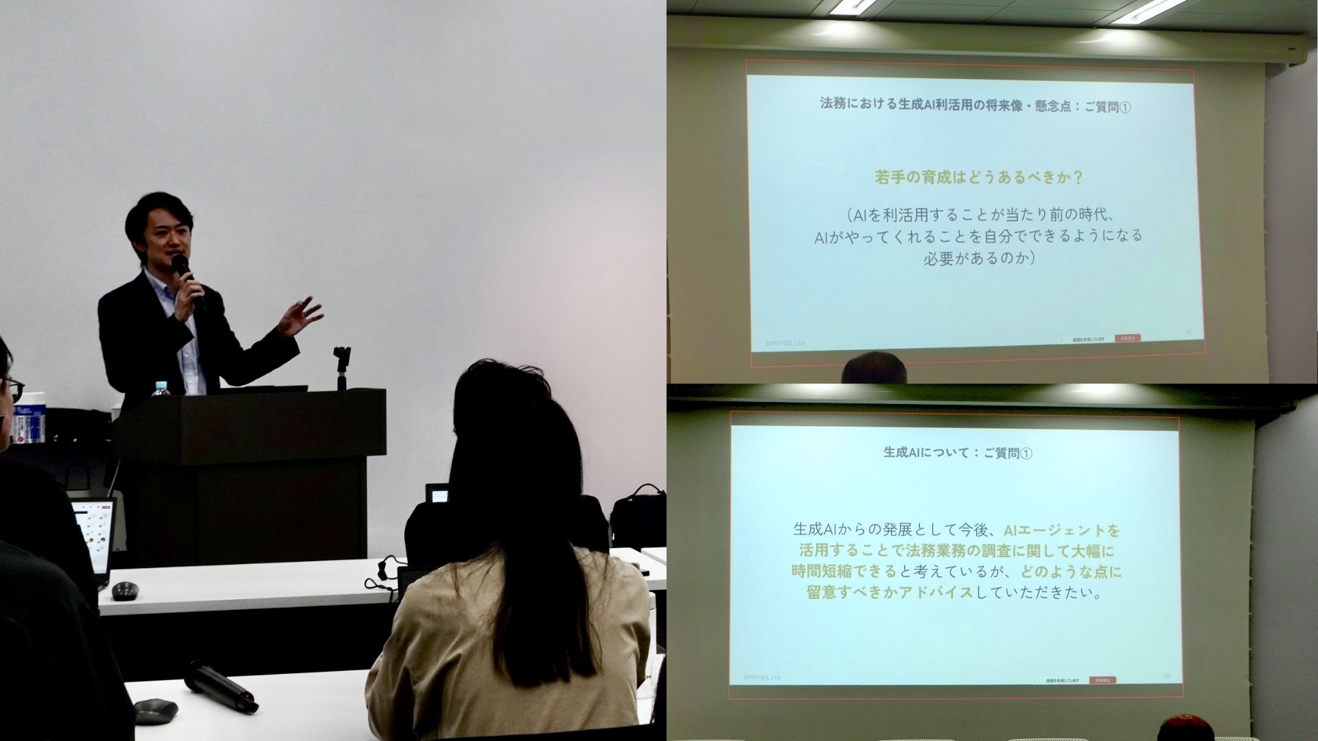 日立製作所では、以前より、生成AIの活用を全社的に推進されており、本勉強会を実施した法務本部においても、既に80%以上の方々が業務でAIを利活用されていらっしゃるとのことでした。しかしその一方で、生成AIの精度のばらつきやハルシネーションなどネガティブな側面に対し、企業としてどう向き合うべきか、AI時代における法務の在り方について、悩みも感じていらっしゃるとのことでした。